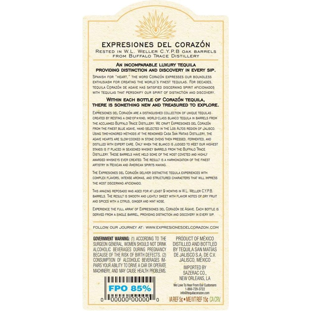 - What makes Corazón Expresiones Reposado unique? This reposado tequila is aged in W.L. Weller C.Y.P.B. bourbon barrels, adding layers of dry fruit and spice notes that blend beautifully with the agave base.