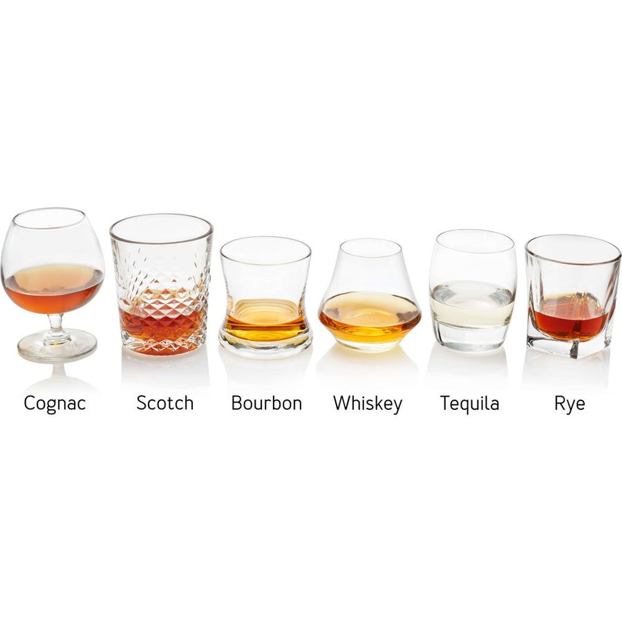 - Includes 1, 9.5-ounce tequila glass; 1, 12-ounce scotch glass; 1, 12-ounce cognac glass; 1, 8.5-ounce bourbon glass; 1, 9.8-ounce whiskey glass; and 1, 9-ounce rye glass