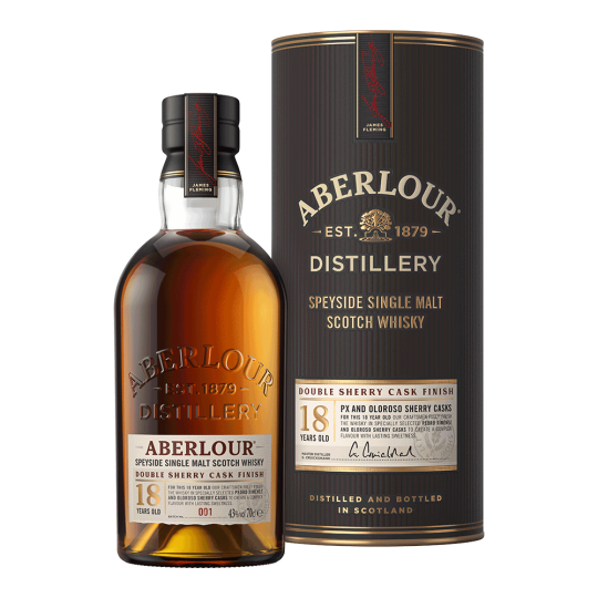 Spicy and luxurious, Aberlour 18 Year Old single malt Scotch whisky is crafted along the River Spey in the Aberlour distillery. A deeper Sherry influence adds more spiciness and a licorice tang. Greater age adds body and develops the distinctive fruitiness to a rich raisin character. Rich and complex notes of toffee and butterscotch combine with ripe peach and bitter orange. Perfect structure. Initial notes of soft apricot and cream are offset by developing flavours of blackcurrant jam and sweet oak with a touch of honey. Very long and balanced, Aberlour 18 Year Old progresses from crème brûlée to a gentle oak flourish